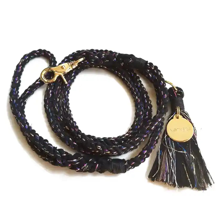 $ 42.00The Satellite Dog Leash Is Super Chic With Just The Right Amount Of Bling. There Are Multi-colored Metallic Threads Woven Through Subtly Along With A Tassel. 100% Cotton Rope , Gold Polish Hardware , Metallic Sparkle Accents, Signature Tassel Dimensions: 5′ L X .5″ Wide Hand Crafted In San Francisco, California