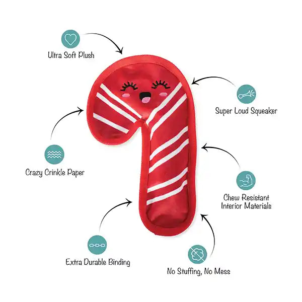 Take A Walk Through Candy Cane Lane! This Durable Candy Cane Dog Toy Is Built To Last Through The Toughest Play Dates. Made With Chew Resistant Interior Materials, Extra Durable Binding, Crazy Crinkle Paper And A Super Loud Squeaker, This Unfilled Tough Dog Toy Was Designed With Extended Playtime In Mind. This Super Chewer Dog Toy Is Sure To Keep Your Pup Feeling Festive All Through The Holiday Season.