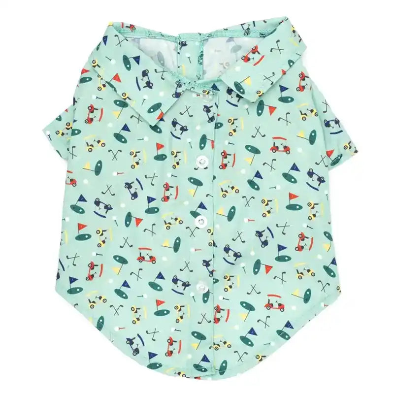 This Charming Dog Shirt Has A Playful Print Of Golf Carts, Clubs, And Balls Against A Minty Backdrop. It’s Comfortable And Easy To Slip On, With Fastener Closures On The Belly And A Fun Faux Button-up Detail On The Back. The High-cut Belly Keeps Pups Looking Sharp On The Go. You And Your Pooch Will Both Adore This Golf-inspired Top!