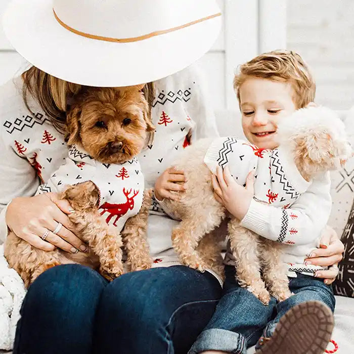 This Dog Threads Sweater Features The Perfect Amount Of Holiday Cheer. Classic holiday Sweater For Dogs And People, Featuring Red And Navy vintage-inspired accents.
