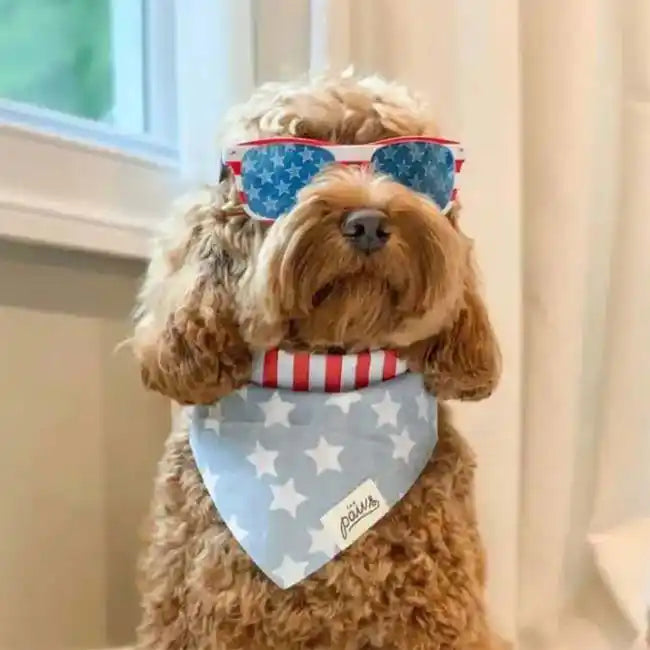 Let Your Pup Show Their Patriotism With This reversible stars And Stripes Pet Bandana. Featuring A Bold Red Stripe Design On One-side And White Stars On A Soft Blue Background On The Other.